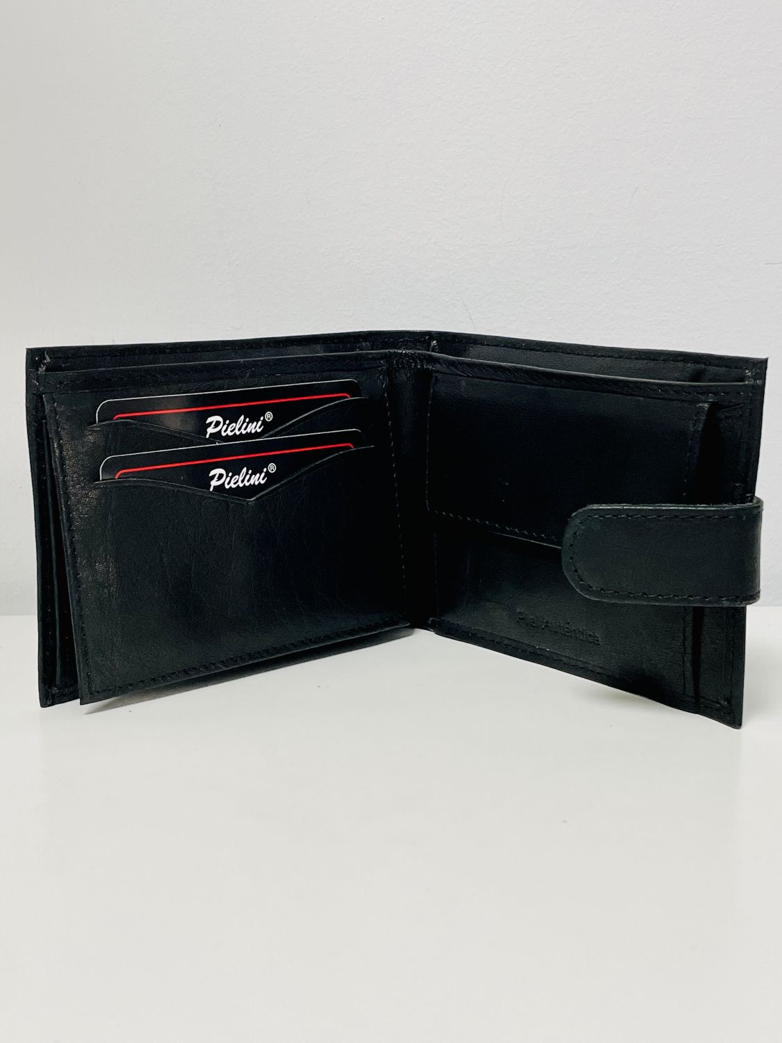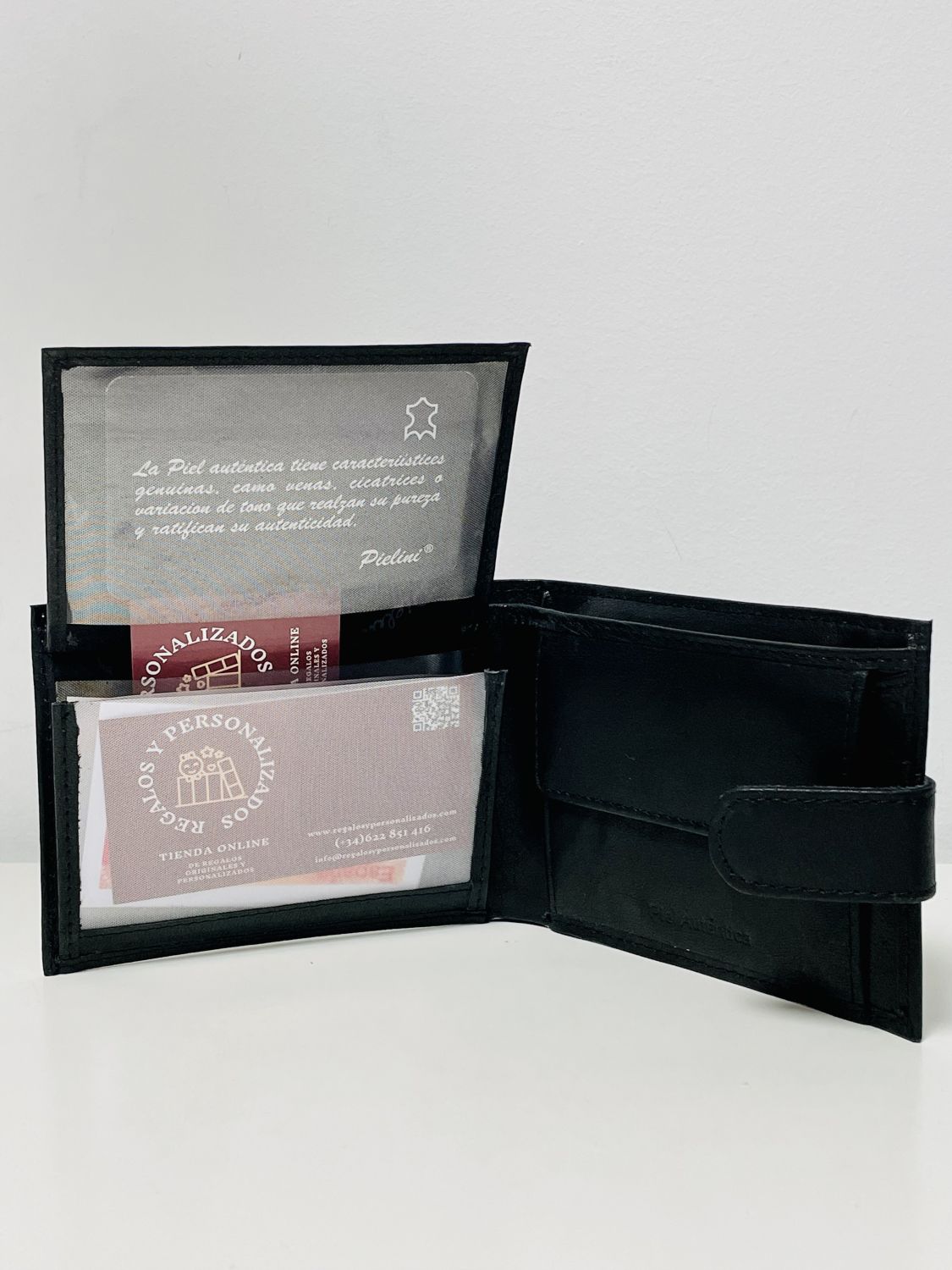 Cartera de caballero en piel de vacuno de primera calidad, tacto suave y agradable, cierre de broche, con multiples departamentos interiores donde llevar ordenadas tarjetas, carnets y dinero en metalico, 2 monederos en el interior uno con cierre de broche y otro con cierre de cremallera.
