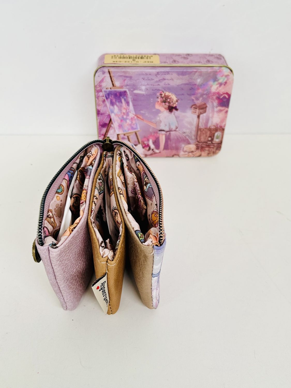 Está fabricado en polipiel y forrado por dentro en tela estampada. Se presenta en cajita de lata decorada con el mismo estampado