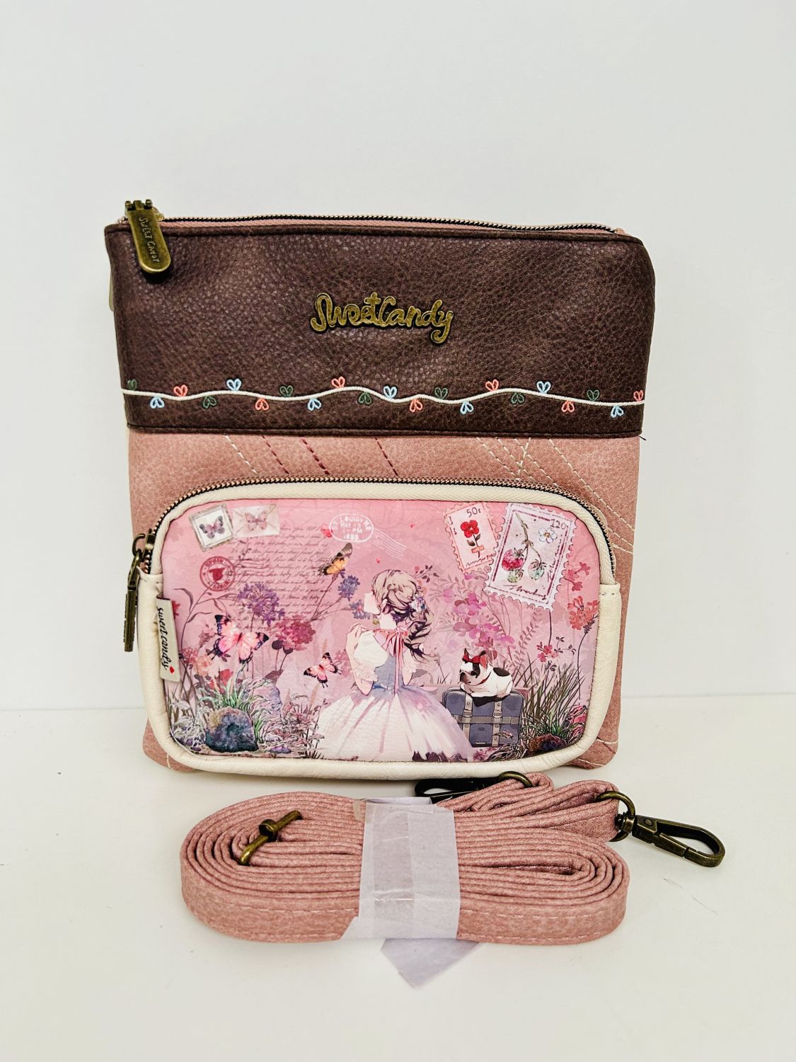 Bandolera 3 compartimentos sweet candy, 2 amplios apartados en la parte superior, bolsillo delantero y otro en la parte posterior,  interior forrado con el estampado sweet candy, cremalleras talladas y correa ajustable¡