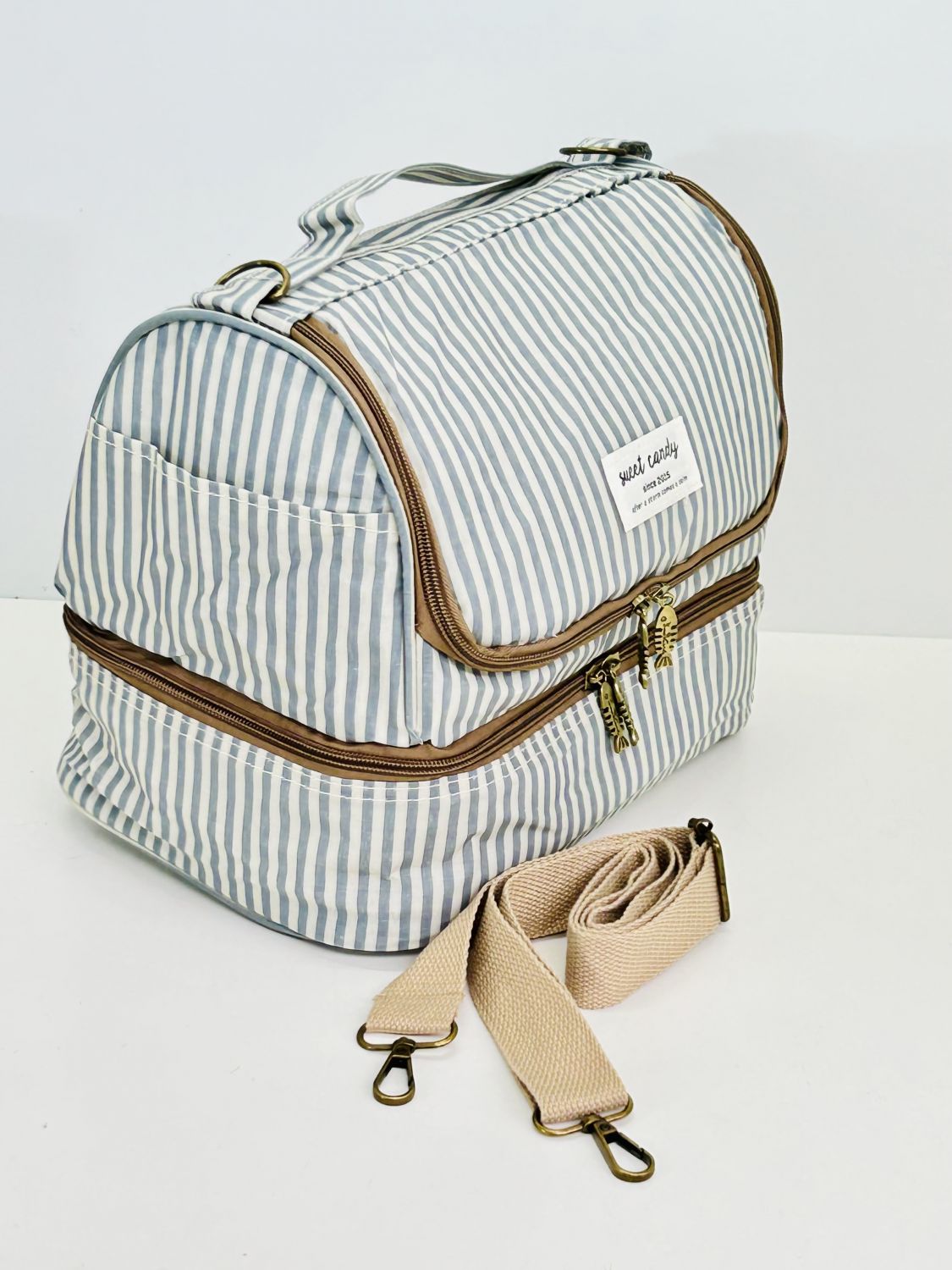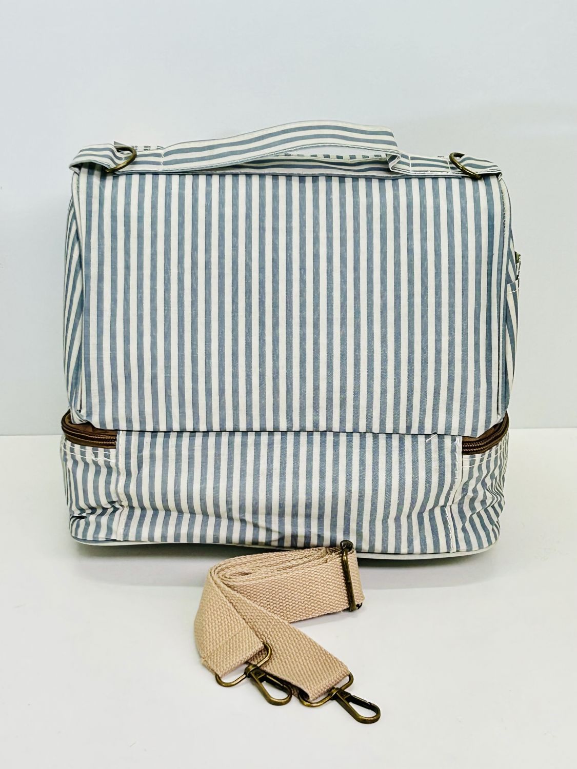 Interior forrado en tela térmica. Con correa ajustable para colgar.