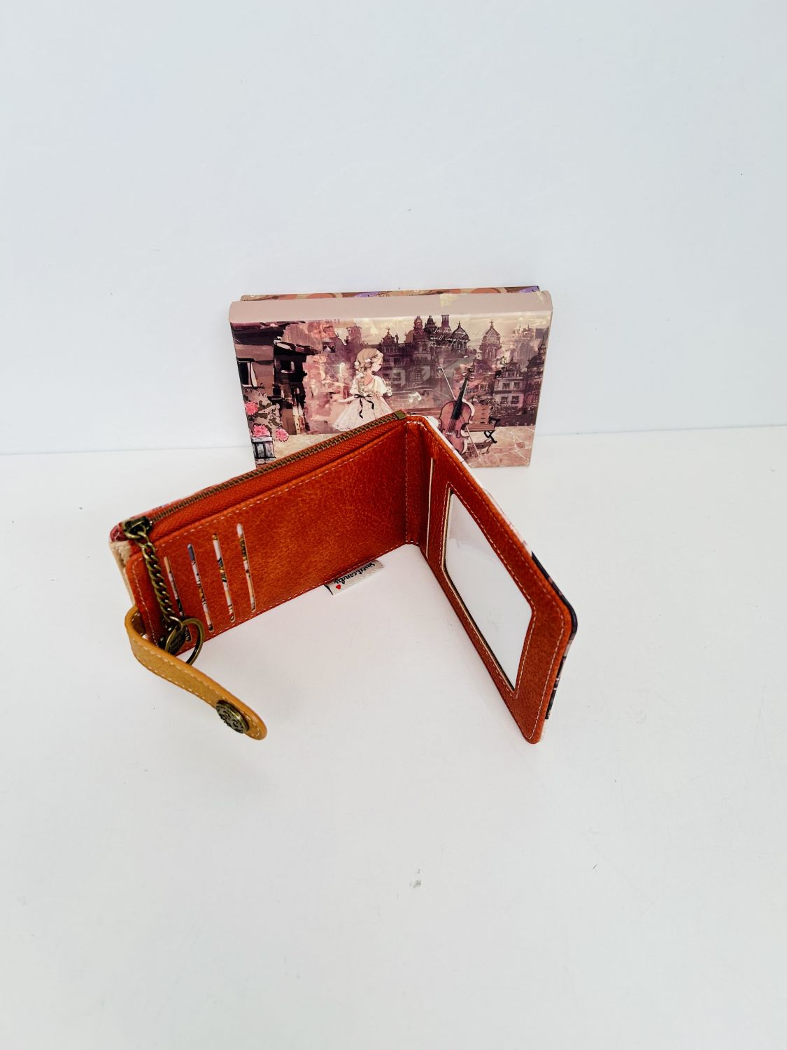 Preciosa cartera con monedero y varios compartimentos para tarjetas, el tirador está fabricado en metal tallado.