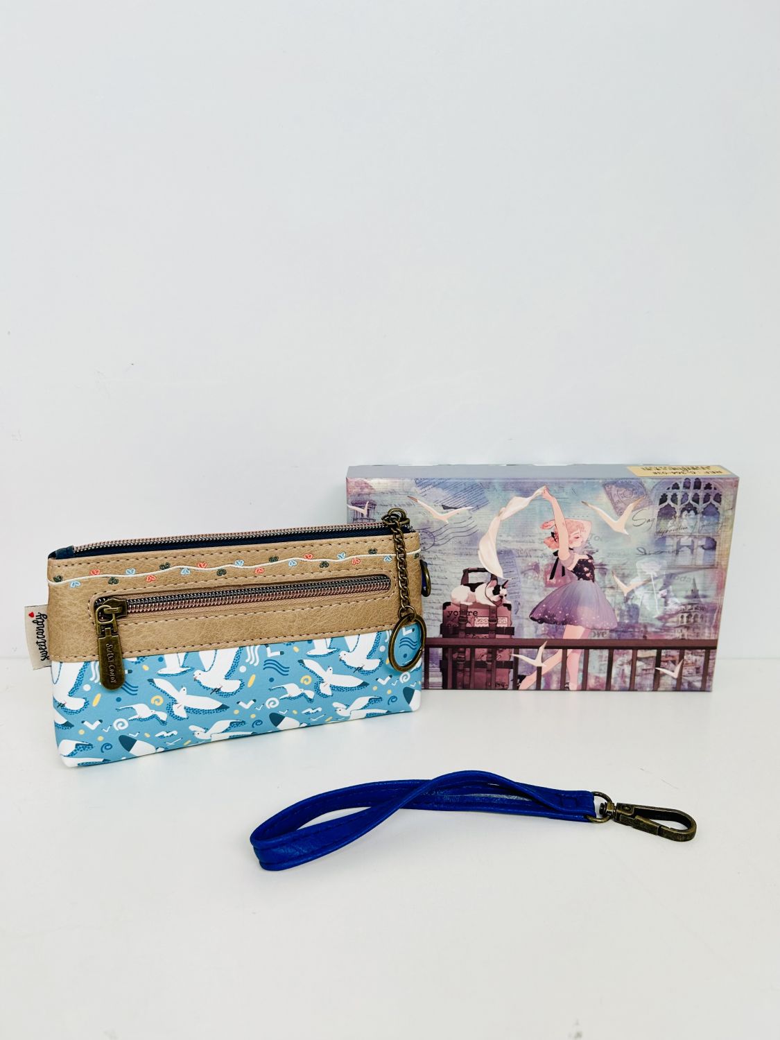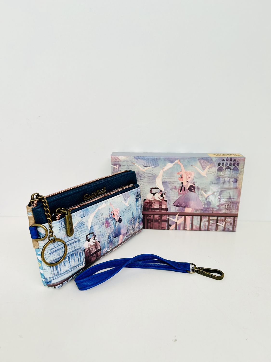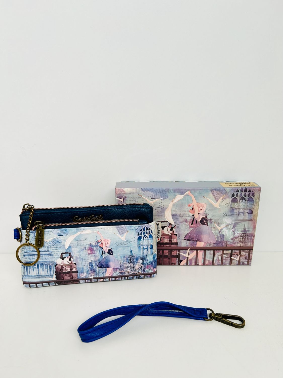 Está fabricado en polipiel y forrado por dentro en tela estampada. Se presenta en cajita de lata decorada con el mismo estampado