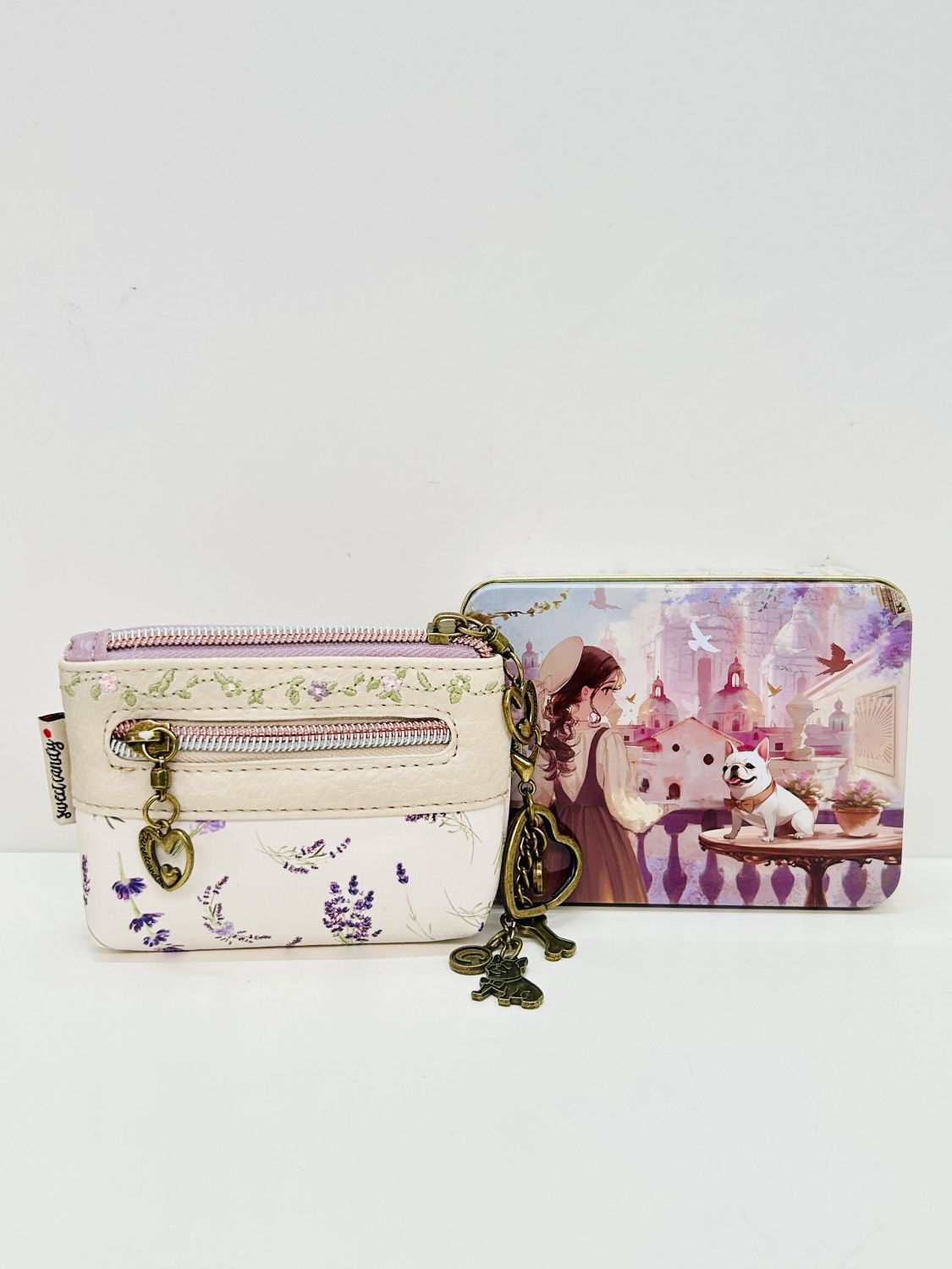 Está fabricado en polipiel y forrado por dentro en tela estampada. Se presenta en cajita de lata de regalo decorada con el mismo estampado de el monedero elegido.