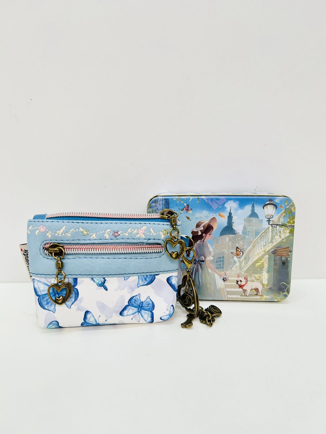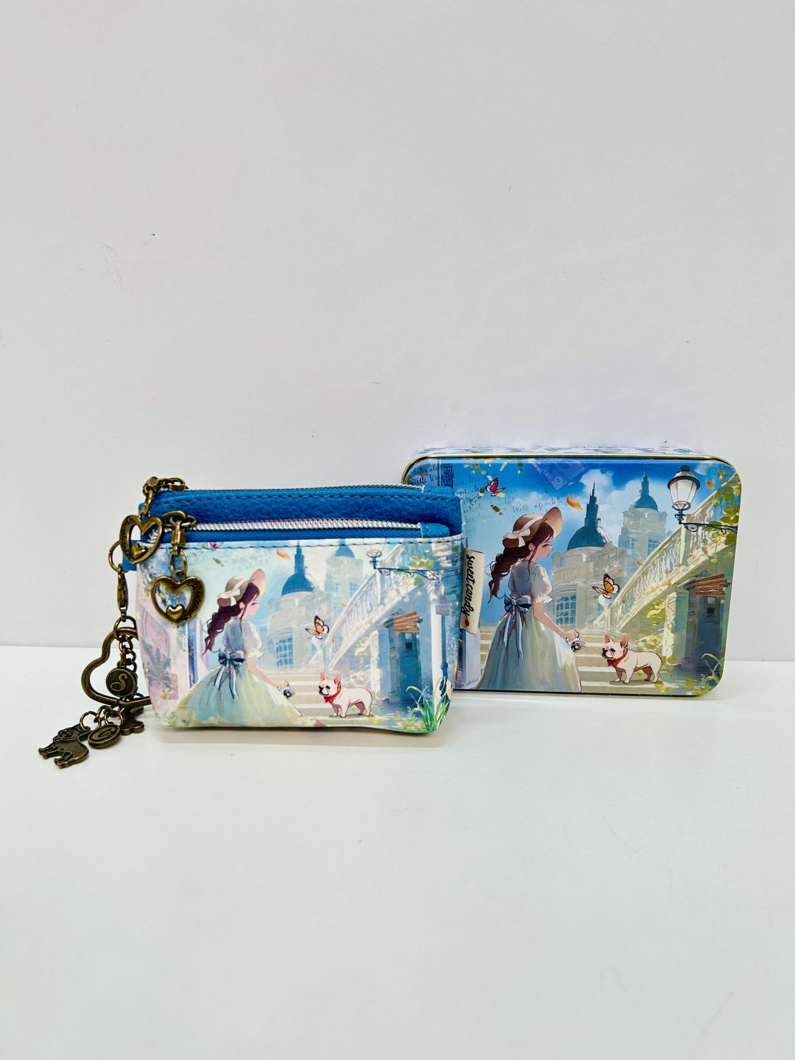 Está fabricado en polipiel y forrado por dentro en tela estampada. Se presenta en cajita de lata de regalo decorada con el mismo estampado de el monedero elegido.