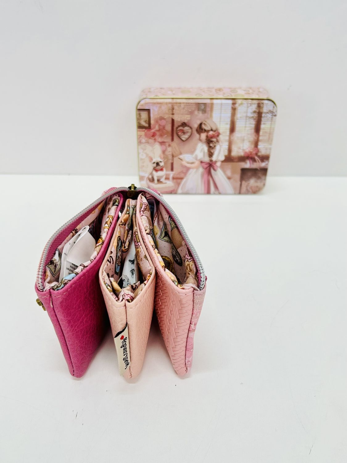 Está fabricado en polipiel y forrado por dentro en tela estampada. Se presenta en cajita de lata decorada con el mismo estampado
